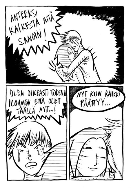 Toinen pienlehteni, tehty kevättalvella 2014. Pyörittelin ideaa laatikossa tulevasta naisesta ja futuristisesta asetelmasta. Ja maailmanlopusta. Minulla oli aikeena tehdä yksi vähän isompi sarjakuvaprojekti toisena vuotenani Limingassa, mutta se ei oikein lähtenyt käyntiin kaiken suunnittelun jälkeen. Sitten vähän selailin vanhaa luonnosvihkoani ja löysin tämän tarinan kuvakäsikirjoituksen, jonka olin tehnyt jo edellisenä keväänä mutta unohtanut täysin. Että keskityinpä sitten tämän piirtämiseen ja se toinen projekti on edelleen hautumassa. Ehkä sille käy samalla tavalla kuin tälle.